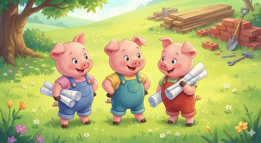 Pufs, kurš bija stiprs, nesa lielus baļķus. Klab, klab, klab! – skanēja viņa soļi. Pifs, kurš bija veikls, zāģēja dēļus un nagloja rāmjus. Džīīīg, džīīīg! Klaudz, klaudz! Nafs, kurš bija gudrs, mērīja, plānoja un mūrēja pamatus. Plikš, plakš! – ķieģelis pie ķieģeļa.