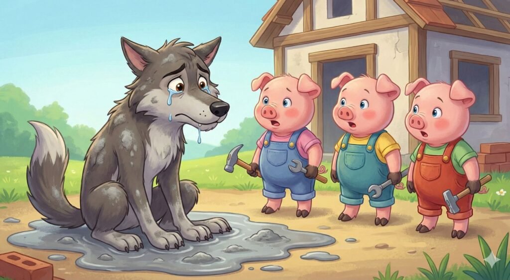 Vilks izskatījās nožēlojami. Viņš bija pelēks no cementa, acis asaroja, un viss viņa “lielais ļaunums” bija pazudis. Viņš apsēdās peļķē un… sāka raudāt. Lielas, slapjas asaras ritēja pār viņa pūkainajiem vaigiem.